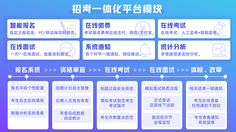 旗下“招考一体化技术平台”可支持从报名缴费、资格审查、在线笔试、在线面试、体检政审全流程或单一模块的功能,云端操作,智能便捷。