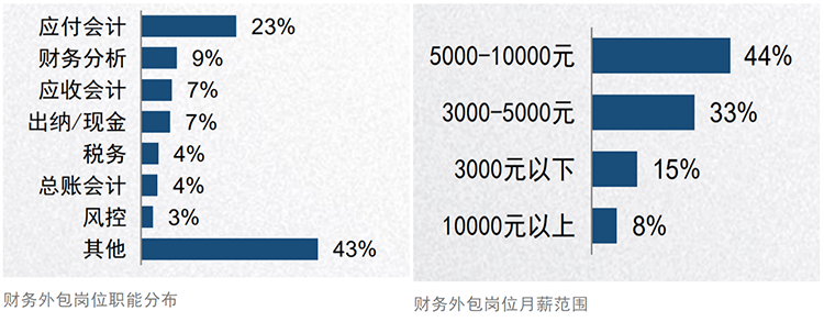 报告显示,现在财务外包主要集中在一些事务性岗位上,我们也可以称之为第一价值活动区。岗位分布以及月薪范围分别为下图。