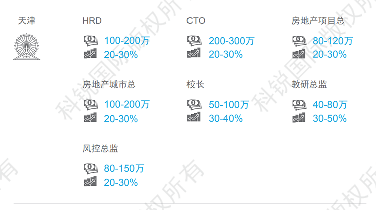 天津整体薪资呈现上涨的趋势,尤其金融、教育、高科技等行业,核心岗位如在线教育的教学教研岗、AI算法、底层开发架构等岗位跳槽涨幅可达30-50%。本数据来源于猎头公司k8凯发国际国际资深行业专家对2021年热门职位薪酬范围及跳槽涨幅的预测,供HR和猎头招聘参考。