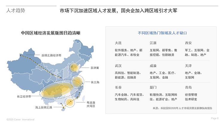 以上,我们按照不同行业划分、归纳出了不同的人才趋势,那么在更宏观的角度,我们还观察到了“人才下沉”。以前,人才主要集中在北上广深等大城市。但今年,明显可以感觉到新一线城市,甚至新一线下面的部分二级、三级市场的开展,加速了当地的人才需求。